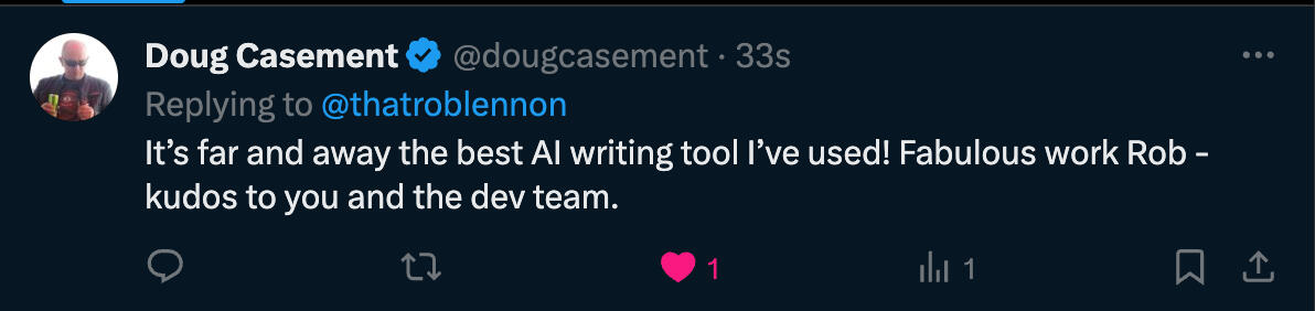 The quality of your content is a major part of how you are perceived.You're not going to publish content co-written by AI unless it reflects really well on you.We get the stakes here. That's why we're focused on writing quality above all else.
